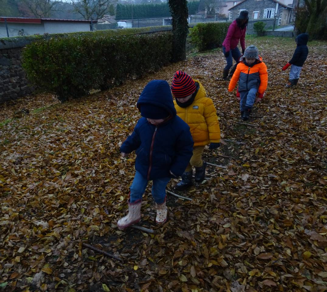Claudine, enseignante en maternelle à Paulhaguet, s'est lancée dans l'expérience de la "classe dehors" à l'automne dernier. Pas si simple au départ de trouver des idées d'activités, de gérer les vêtements, les pauses "pipi" ou la météo mais pour rien au monde elle ne reviendrait en arrière. Car la classe dehors, ça apporte beaucoup: les élèves sont plus acteurs de leurs apprentissages, ils sont plus motivés et font des liens entre ce qui est fait dehors et ce qui est fait à l'intérieur. Et s'agissant des activités, cela devient une habitude de travail de penser une partie de la séquence avec une phase en extérieur. Les idées viennent au fur et à mesure et les échanges avec les collègues ouvrent d'autres perspectives. Claudine connait plutôt bien la nature, c'est vrai, mais elle apprend aussi en fonction des découvertes et des questionnements des élèves. L'important pour l'enseignant, ce n'est pas de tout savoir sur les plantes ou les animaux, l'important c'est l'éveil de la curiosité chez les enfants, le questionnement, le travail de recherche de réponses et l'expérimentation par le corps (5 sens). Voici quelques exemples d'activités pour les PS: