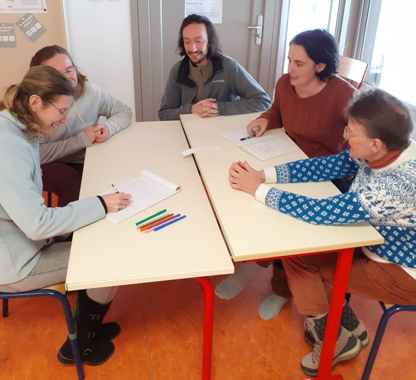 Le premier temps de rencontre a eu lieu le 10 janvier à Queyrières. La neige était au rendez-vous, en bonne quantité même, mais cela n'a pas freiné les dix enseignants qui étaient au contraire très heureux de voir enfin ce beau manteau blanc. La journée a débuté avec un travail autour de l'exposition de l'IREPS avec Léa Chevalier : lecture-découverte en extérieur, réalisation d'une affiche pour mettre en avant les éléments marquants, joute orale (arguments et contre-arguments) sur un projet d'Ecole dehors. Ensuite, des activités ont été proposées autour du lichen qui liaient observations dehors et lectures documentaires. Enfin, les enseignants ont pu découvrir des activités autour de la neige : observation de la structure des flocons, puzzles, acrosport, peinture sur neige...Compte-rendu de la journée du 10/01 (pour les documents complémentaires cités, contactez l'OCCE 43)