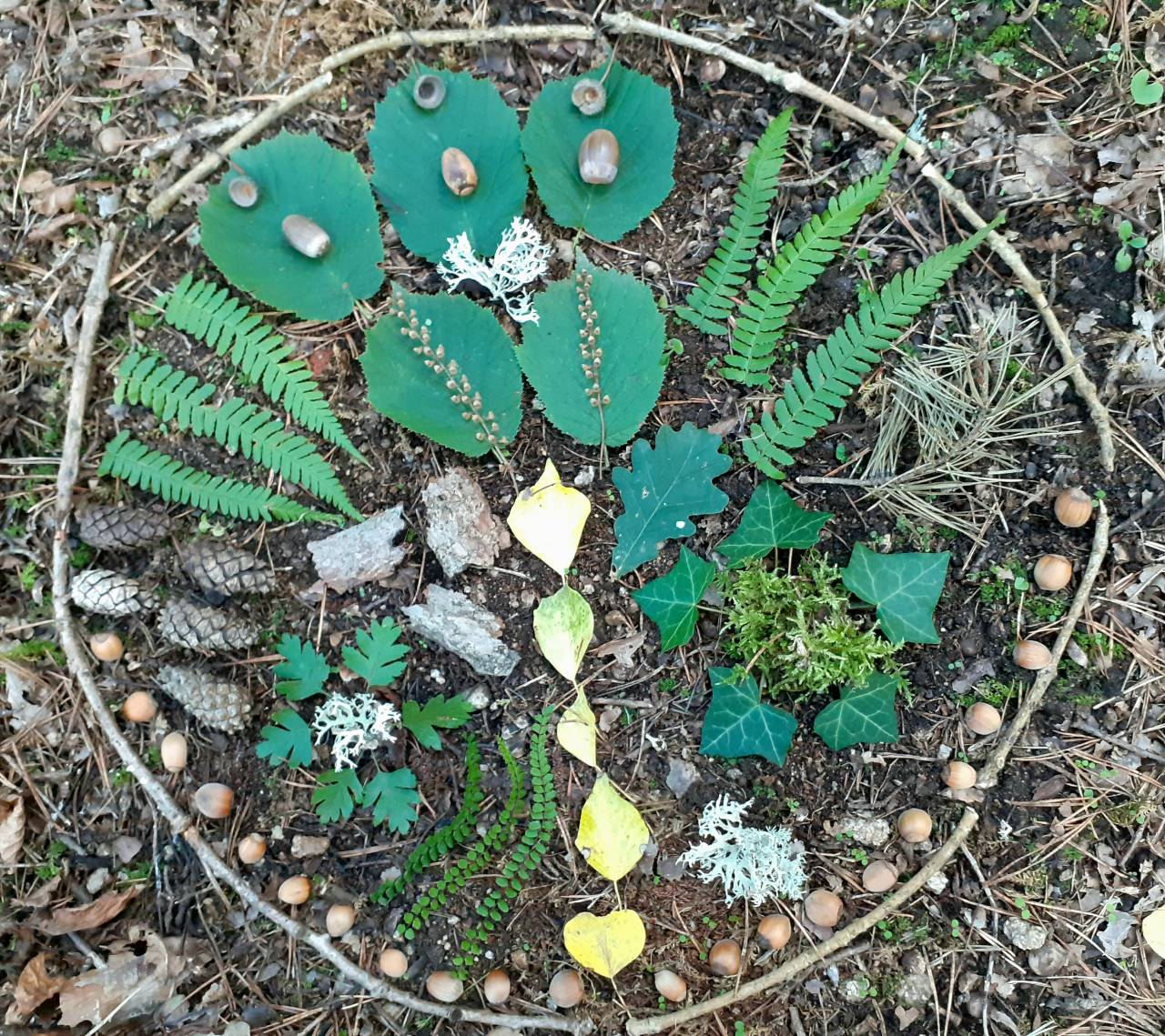 NUMERATION/REPERAGE DANS L'ESPACE : Les maternelles, en petits groupes, cherchent et récoltent les élements de la forêt (ici une fleur séchée de sauge des bois) pour reconstituer collectivement le "gâteau d'automne"